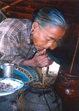 cm hohe Keramikkrüge voll bis zum Stehkragen mit Reiswein. Eine 72jährige