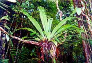 Licht durchfluteten Kronen der Bäume hängen die langen Blätter der Epiphyten.