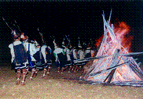 Stammestänze des Tages um das hoch auflodernde Feuer wiederholt.