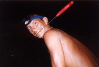 Nun nimmt er die Machete quer in den Mund und hält sie mit seinen Zähnen